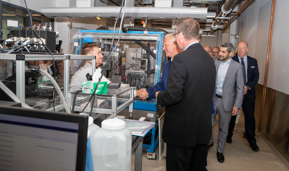 Premier Doug Ford greets a researcher at the Fraunhofer-McMaster Project Centre for Biomedical Engineering and Advanced Manufacturing. Photo by Georgia Kirkos.